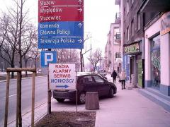 Gdyby niektóre znaki nie były pozasłaniane reklamami, byłoby widać, że samochody na tym odcinku ulicy także parkują niezgodnie z intencją projektanta, zabierając miejsce pieszym.