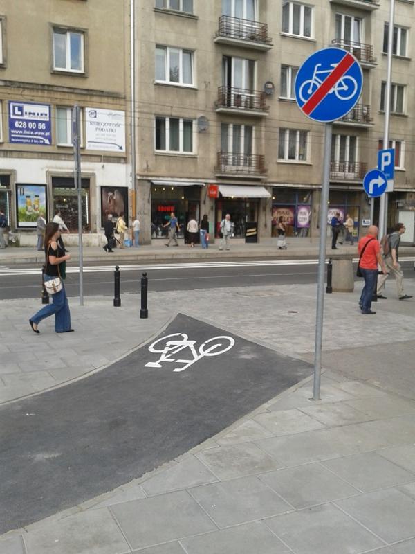 Wjazd w ul. Nowowiejską w kierunku Pl. Zbawiciela odbywa się przez włączenie drogi rowerowej we wjazd bramowy.
