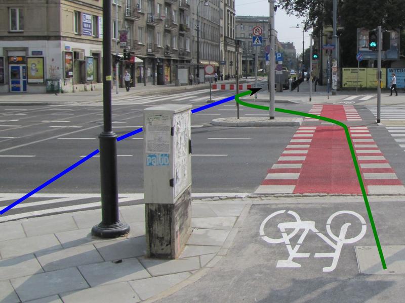 Dlatego lepiej włączyć się do ruchu już wcześniej, skręcając z przejazdu na jezdnię (na zdjęciu na zielono). Oszczędza to także jednego punktu kolizji z ruchem samochodowym i jednego z ruchem pieszym. Jeszcze lepiej byłoby, gdyby przejazd był bliżej torów (trasa na niebiesko).