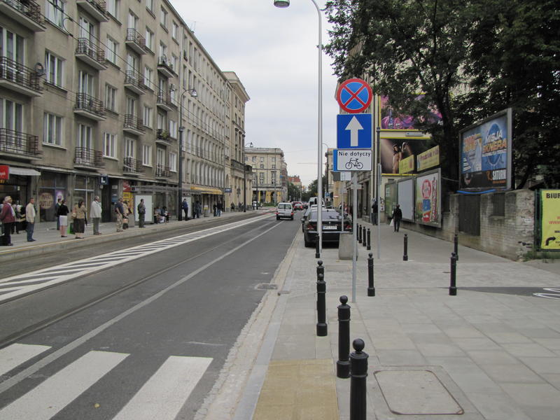 Niezależnie od obranego wariantu pokonania Waryńskiego, dalej w stronę placu Zbawiciela jedziemy jezdnią razem z samochodami, nie wjeżdżamy na torowisko.