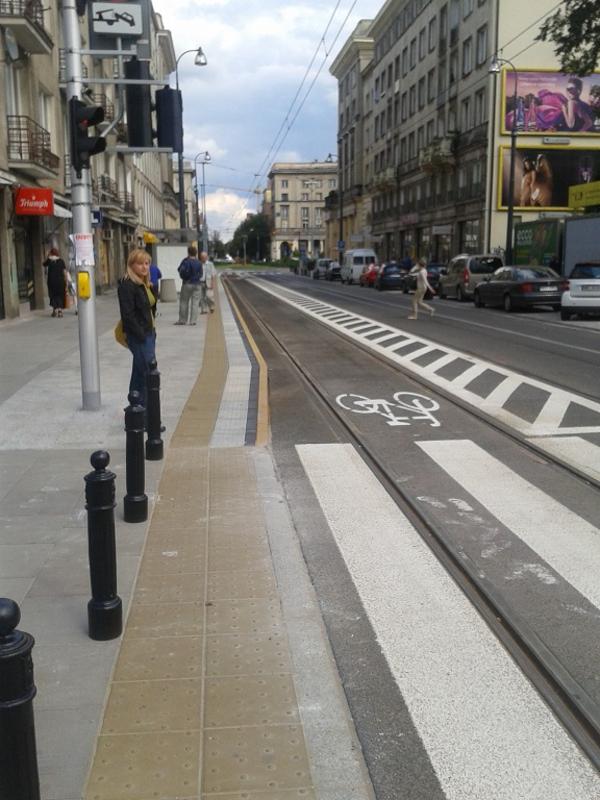 Pomiędzy Pl. Zbawiciela i ul. Waryńskiego rowerzyści poruszają się w kierunku Politechniki po torowisku tramwajowym, a w przeciwnym kierunku z ruchem drogowym.