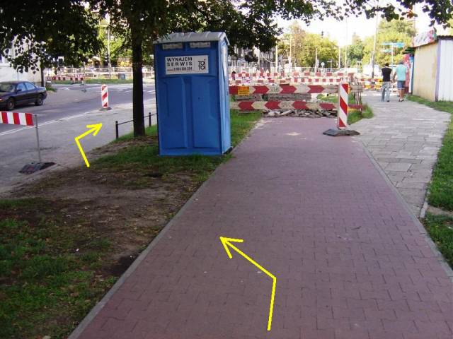 Jadący od zachodu w kierunku Marymonckiej napotykają taki widok. Zalecamy zjechanie ze ścieżki w lewo, na wyłączony pas jezdni. Można nim przeciąć skrzyżowanie bez przeprawy przez bardzo uciążliwą kładkę nad wykopem i ryzyka zderzenia z użytkownikiem toalety (którą na czas robót przestawiono dochowując tradycji umieszczania jak najbliżej ścieżki [zobacz >>>]).