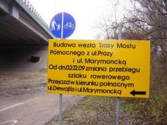 Podążając za nią już po 50 metrach rozczarują się trafiając na kolejną tablicę. Jeśli ktoś ją zignoruje, skończy jak ten zdegustowany rowerzysta, który musiał zawrócić nie znajdując objazdu wskazanego przez pierwszą tablicę. Ta mówi prawdę o zamkniętym dojeździe i przejściu do ul. Prozy, ale w połączeniu z pierwszą wywołuje niemały dysonans poznaczy.