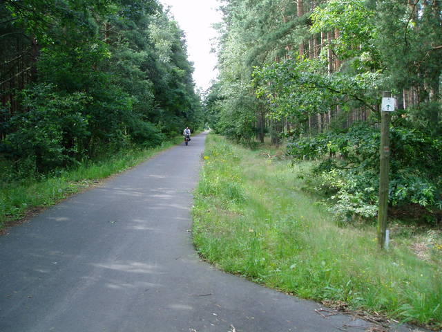 Leśna droga gospodarcza wyasfaltowana i przeznaczona do ruchu rowerów.