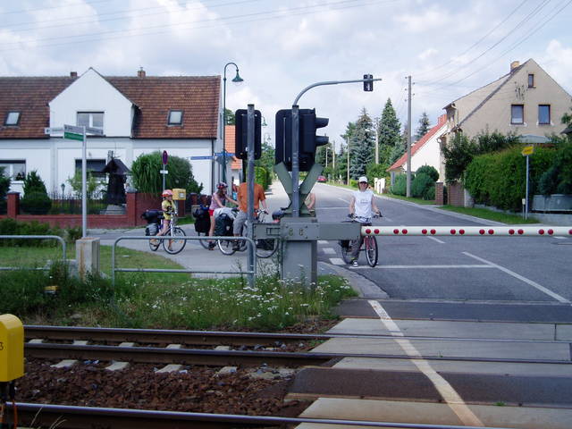 Odcinek po drogach lokalnych na północ od Guben - kolejka pojazdów oczekujących przed przejazdem kolejowym w Coschen.