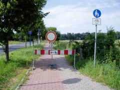 Peryferia Eisenhüttenstadt: zakończenie drogi rowerowej z pasem włączenia w jezdnię. Zmiana konstrukcji nawierzchni następuje prostopadle do toru jazdy rowerzysty, a różnicę wysokości zniwelowano w zasadzie do zera. Wyeliminowano w ten sposób ryzyku uślizgu na ukośnym uskoku, konieczność wykonywania przeciwskrętu czy inne atrakcje zapewniane przez polskich projektantów.