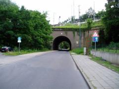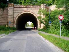 Wjazd do Frankfurtu nad Odrą, ulica Buschmühlenweg w ciągu drogi L381, tunel w nasypie linii kolejowej Warszawa - Berlin. Żeby uniknąć kosztów związanych z drążeniem osobnego tunelu dla pieszych i rowerzystów... zwężono jezdnię do jednego pasa.