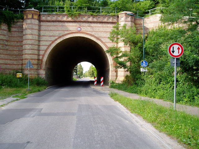 Wjazd do Frankfurtu nad Odrą, ulica Buschmühlenweg w ciągu drogi L381, tunel w nasypie linii kolejowej Warszawa - Berlin. Żeby uniknąć kosztów związanych z drążeniem osobnego tunelu dla pieszych i rowerzystów... zwężono jezdnię do jednego pasa.