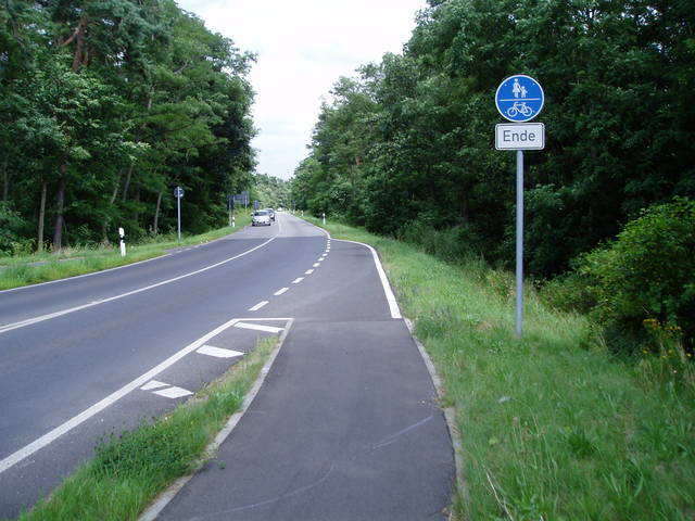 Peryferia Eisenhüttenstadt: zakończenie drogi rowerowej z pasem włączenia w jezdnię. Zmiana konstrukcji nawierzchni następuje prostopadle do toru jazdy rowerzysty, a różnicę wysokości zniwelowano w zasadzie do zera. Wyeliminowano w ten sposób ryzyku uślizgu na ukośnym uskoku, konieczność wykonywania przeciwskrętu czy inne atrakcje zapewniane przez polskich projektantów.