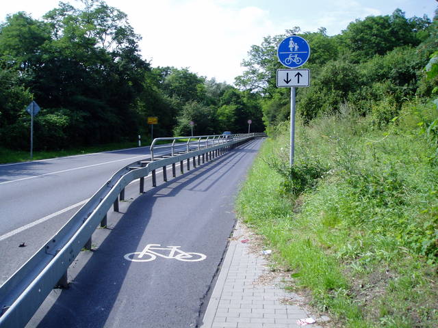 Dalszy odcinek drogi 112. Ze względu na słabą dostępność terenu w miejscu pokonywania skarpy ograniczono przekrój drogi z 2+1 do 1+1 i wygrodzono jeden pas ruchu aby zachować ciągłość ciągu pieszo-rowerowego. Przykład szczególnie ciekawy w kontekście dyskusji na temat przebudowy dróg z poboczami do przekroju 2+1. Niemcy uznali, że na głównych drogach dla bezpieczeństwa ważniejsza jest segregacja ruchu niezmotoryzowanego (1+1+ciąg pieszo-rowerowy) niż zapewnienie możliwości wyprzedzania (2+1).