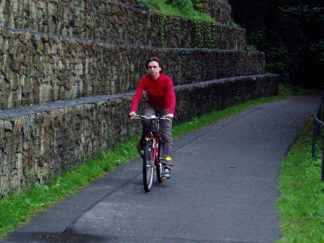 Wyjazd z Görlitz na południe. Mimo, że okoliczny teren jest górzysty, dzięki przebiegowi wzdłuż Nysy różnice wysokości i nachylenia na szlaku są minimalne. Warto też zwrócić uwagę na wzorcową skrajnie - droga rowerowa zachowuje odstęp zarówno od skarpy jak i barierek na brzegu.