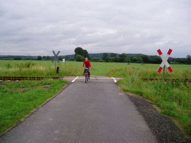 Przejazd rowerowy przez tory kolejowe nie wymaga kosztownej automatyki za kilkaset tysięcy złotych, choć pociągi ODEG na tej linii mkną szybciej niż InterCity Warszawa - Gdańsk. Wystarczy zapewnić dobrą widoczność.