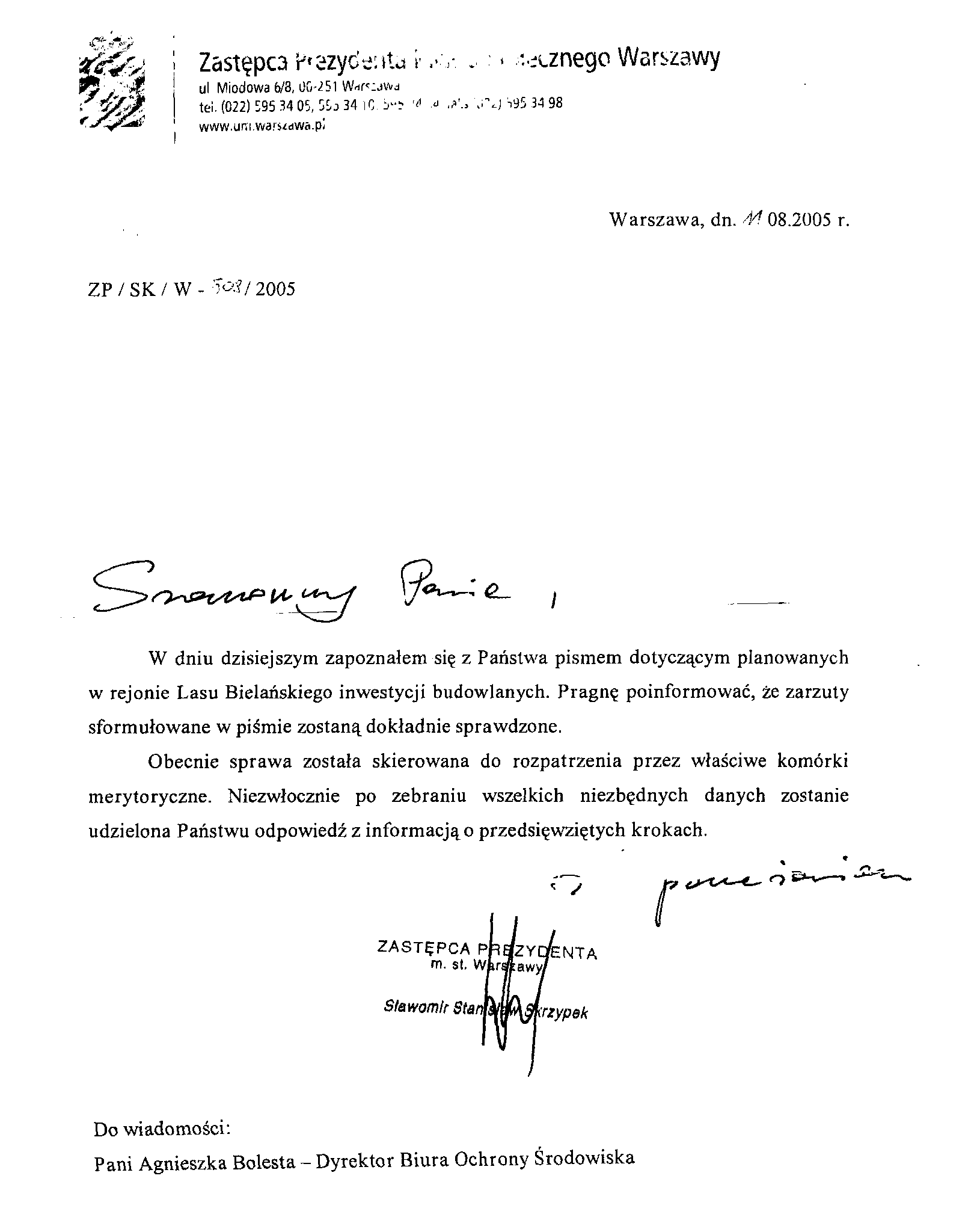 W odpowiedzi na List Otwarty skierowany do Pani Hanny Gronkiewicz-Waltz Prezydent m.st, Warszawy, w sprawie ochrony Lasu Bielańskiego, informuję co następuje: