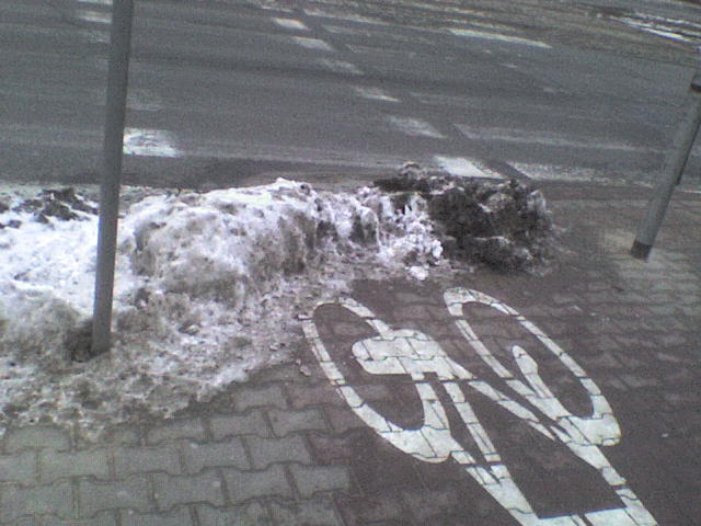 Ulica Jana Pawła II, 14 stycznia 2009 r. Przejazd rowerowy zablokowany przez niewielką, ale nieprzejezdną dla cyklisty hałdę lodu. Zostało zrobione tydzień po ostatnim opadzie śniegu. Gdyby podczas odśnieżania sąsiedniego chodnika wykonać dwa ruchy łopatą więcej, zlikwidowano by przeszkodę stanowiącą przez wiele dni zagrożenie dla każdego użytkownika ścieżki.