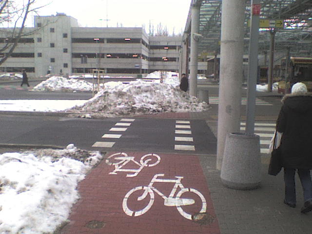 Metro Młociny, 25 lutego 2009 r. Zdjęcie ilustruje powszechną w Warszawie praktykę zasypywania ścieżek śniegiem zgarniętym z ulicy i chodnika.