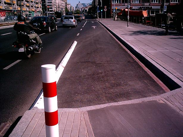 To jedno z nielicznych miejsc, gdzie separatory zamontowano. Podobne na pl. Narutowicza zniknęły po kilku miesiącach. Ten już wytrzymał dłużej - widocznie dla ZOM-u nie stanowi problemu, bo przecież drogi rowerowe odśnieżane są sporadycznie