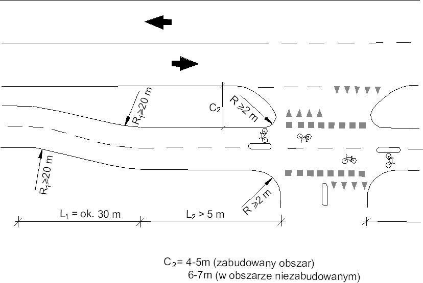 Poprawne odsunięcie drogi dla rowerów na zewnątrz z zachowaniem minimalnych promieni łuków i odcinkiem prostym przed przejazdem. Na podstawie Design Manual for Bicycle Traffic