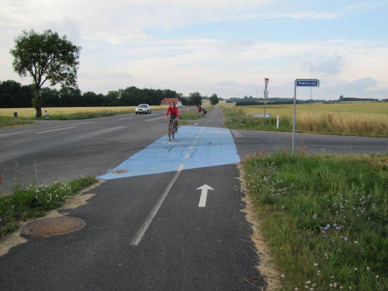 Przejazd na wprost na skrzyżowaniu dróg zamiejskich na Bornholmie (Dania).