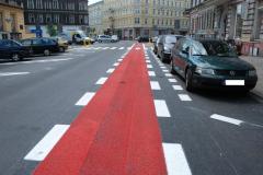 - oznakowaniem pionowym i poziomym na całej długości, z możliwością dodatkowego zróżnicowania barwy nawierzchni przeznaczonej do ruchu rowerzystów – na ulicach o większych natężeniach ruchu lub prędkościach miarodajnych wyższych niż 30 km/h [fot. Rowerowy Szczecin];