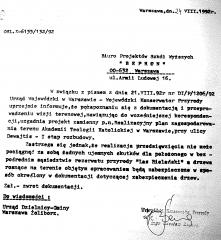 W związku z pismem z dnia 21 sierpnia 92r. nr DI/P/1206/92 Urząd Wojewódzki w Warszawie - Wojewódzki Konserwator Przyrody uprzejmie informuje, że po zapoznaniu się z dokumentacją i przeprowadzeniu wizji terenowej, nawiązując do wcześniejszej korespondencji, uzgadnia projekt zamienny p.n. Realizacyjny plan zagospodarowania terenu Akademii Teologii Katolickiej - I etap rozbudowy.