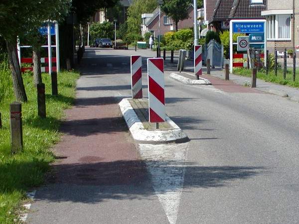 Ulica przyjazna dla rowerzystów -- ulica o ruchu uspokojonym, w której prędkość nie przekracza 30 km/godz., wyposażona w rozwiązania techniczne wymuszające ograniczenie prędkości samochodów (progi spowalniające, szykany, podniesione tarcze skrzyżowania i przejścia dla pieszych). W miastach północnej i zachodniej Europy tego typu ulice stanowią 70-80% sieci drogowej (a jednocześnie rowerowej). Na zdjęciu Nieuwveen, Holandia -- uspokojenie ruchu poprzez esowanie toru jazdy samochodów z pozostawieniem przejazdu dla rowerzystów na wprost.