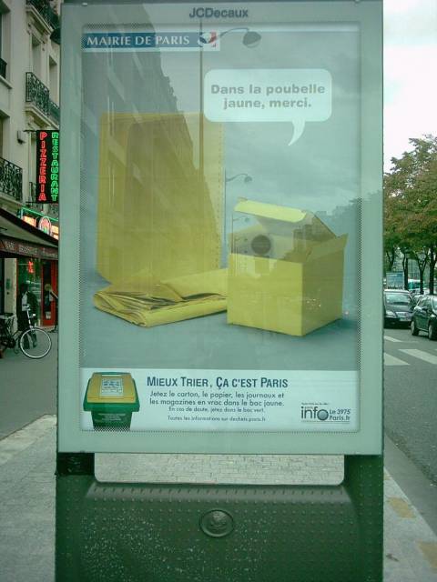 Do sortowania śmieci zachęcają bilbordy ufundowane przez paryskie merostwo. Poza podziałem na plastiki, szkło i papier, osobno zbierane są też odpady organiczne.