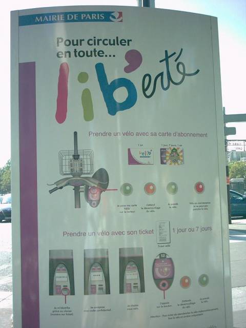 Jest to zakrojona na wielką skalę inicjatywa Vélib’ (skrót od vélos en libre-service, czyli rowerów samoobsługowych), które można wypożyczać za pomocą paryskiego odpowiednika Warszawskiej Karty Miejskiej lub, gdy rower chce wypożyczyć ktoś kto nie mieszka w Paryżu na co dzień, karty płatniczej. Pierwsze pół godziny nic nie kosztuje, także krótkie podróże można odbywać całkowicie za darmo, o ile odstawi się rower do któregokolwiek z dedykowanych stojaków.