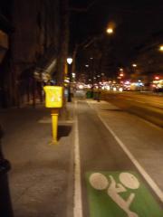 Tak jak pisałem w poprzednim sprawozdaniu z francuskiej stolicy [zobacz >>>], pasy dla rowerów przy miejscach parkingowych oddzielone są wyniesieniem zapobiegającym wjeżdżaniu na ścieżkę oraz otwieraniu drzwi w jej świetle.