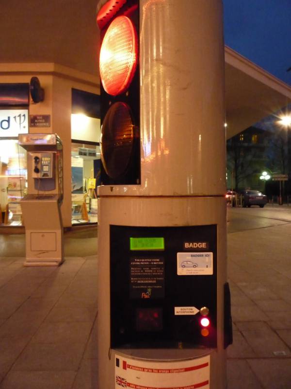 Zbliżenie na słup przy radiowozie na poprzednim zdjęciu. Instrukcje zaczynają się od informacji "Opuszczają państwo centrum przeznaczone dla pieszych."