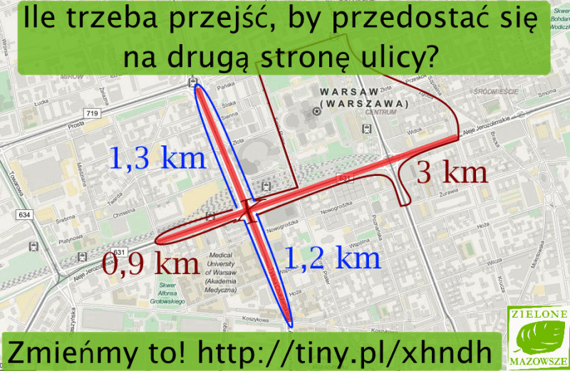 Po przebudowie w proponowanym przez ZDM kształcie centrum miasta pozostałoby czarną dziurą komunikacji pieszej, z odległościami rzędu 1,5 km między najbliższymi przejściami dla pieszych.