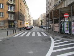 Wlot ulicy Noakowskiego zwężono o połowę, z 9 m do 4,5 m. Dzięki temu odzyskano sporo miejsca i poprawiła się wzajemna widoczność pieszych i kierowców.