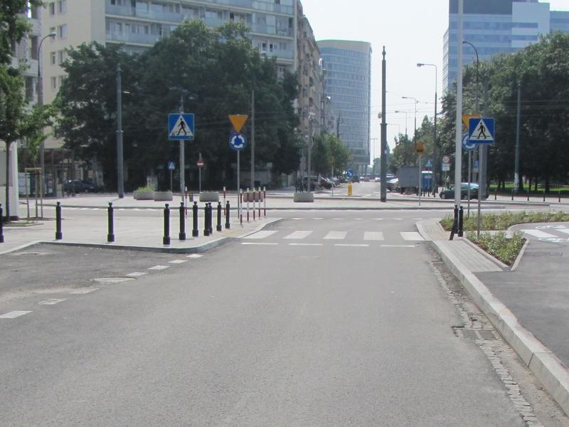 Wlot ulicy Noakowskiego zwężono o połowę, z 9 m do 4,5 m. Dzięki temu odzyskano sporo miejsca i poprawiła się wzajemna widoczność pieszych i kierowców.