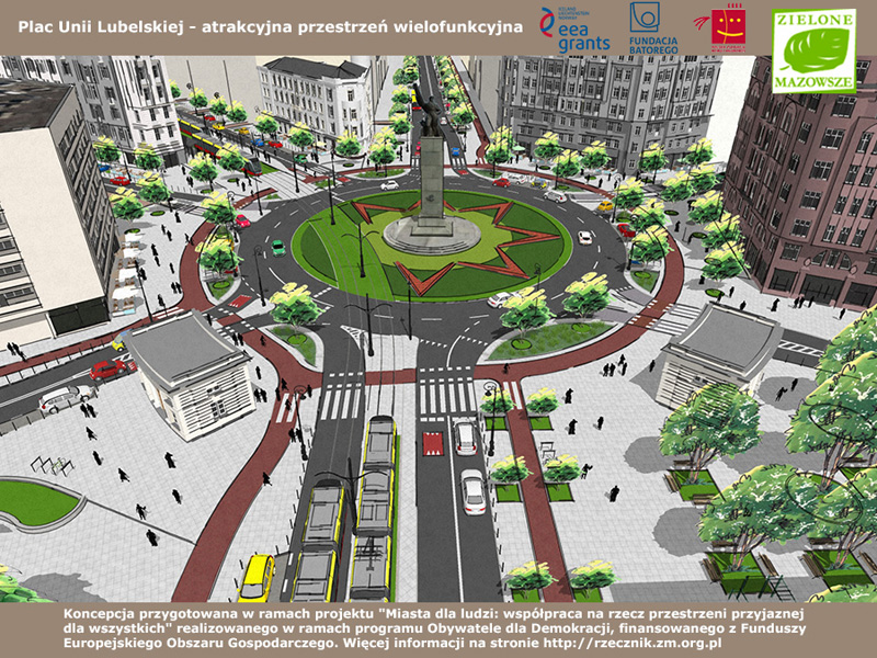 Na środku placu, jak też wokół jezdni, znajdzie się miejsce na zieleń. Na wizualizacji przewrotnie przywrócono Pomnik Lotnika do przedwojennej lokalizacji. Nie jest to element konieczny, ale na pewno konieczne są gruntowne zmiany, by plac Unii Lubelskiej stał się placem na miarę stolicy państwa Unii Europejskiej.