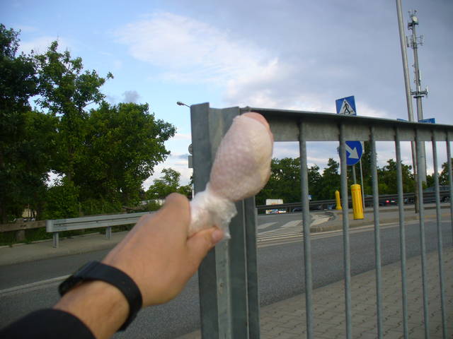 Zakupioną nóżką kurczaka uderzamy z niewielką siłą we wspornik po jego ostrej stronie, symulując przypadkowe nadzianie się na słupek.