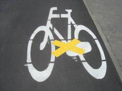 Nieco rzadszą ale też stosowaną dla dróg rowerowych praktyką jest unieważnianie oznakowania poziomego żółtymi przekreśleniami. Sygnalizuje się w ten sposób, że trasa nie została oficjalnie dopuszczona do ruchu, nie ma wszystkich niezbędnych pozwoleń, więc inwestor nie ponosi odpowiedzialności za skutki korzystania z niej.