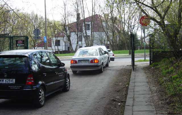 Widok z terenu AWF na to samo miejsce przy posesji Podleśna 38. Kierowcy wjeżdżających samochodów mają bardzo ograniczoną widoczność przed przecięciem ścieżki rowerowej. Po prawej ledwie widoczny znak ”Stop”. [zobacz >>>]