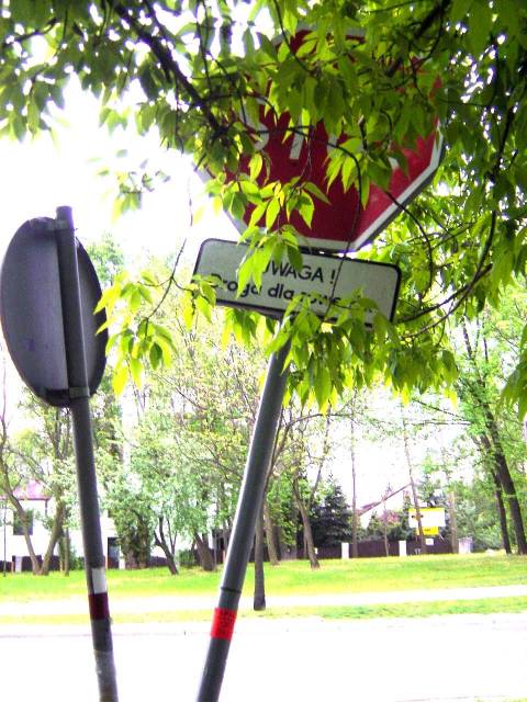Zasłonięty gałęzią znak ”Stop” przy tym wyjeździe z AWF. Tablicę ”Uwaga! Droga dla rowerów” pod nim sugerujemy zastąpić znakiem ostrzegawczym A-24.