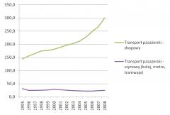 Wykres 1. Przewozy pasażerskie transportem drogowym i szynowym w Polsce w latach 1995–2008 (w mld pkm). Żródło: EU energy and transport in figures. 2006. European Commission, Directorate General for Energy and Transport in co-operation with Eurostat; EU energy and transport in figures 2009. European Commission, Directorate-General for Energy and Transport; EU energy and transport in figures. Statistical pocketbook 2010. European Commission.