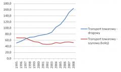 Wykres 2. Przewozy towarowe transportem drogowym i szynowym w Polsce w latach 1995–2008 (w mld tkm). Żródło: EU energy and transport in figures. 2006. European Commission, Directorate-General for Energy and Transport in co-operation with Eurostat; EU energy and transport in figures 2009. European Commission, Directorate-General for Energy and Transport; EU energy and transport in figures. Statistical pocketbook 2010. European Commission.