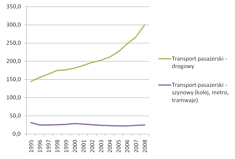 Wykres 1. Przewozy pasażerskie transportem drogowym i szynowym w Polsce w latach 1995–2008 (w mld pkm). Żródło: EU energy and transport in figures. 2006. European Commission, Directorate General for Energy and Transport in co-operation with Eurostat; EU energy and transport in figures 2009. European Commission, Directorate-General for Energy and Transport; EU energy and transport in figures. Statistical pocketbook 2010. European Commission.