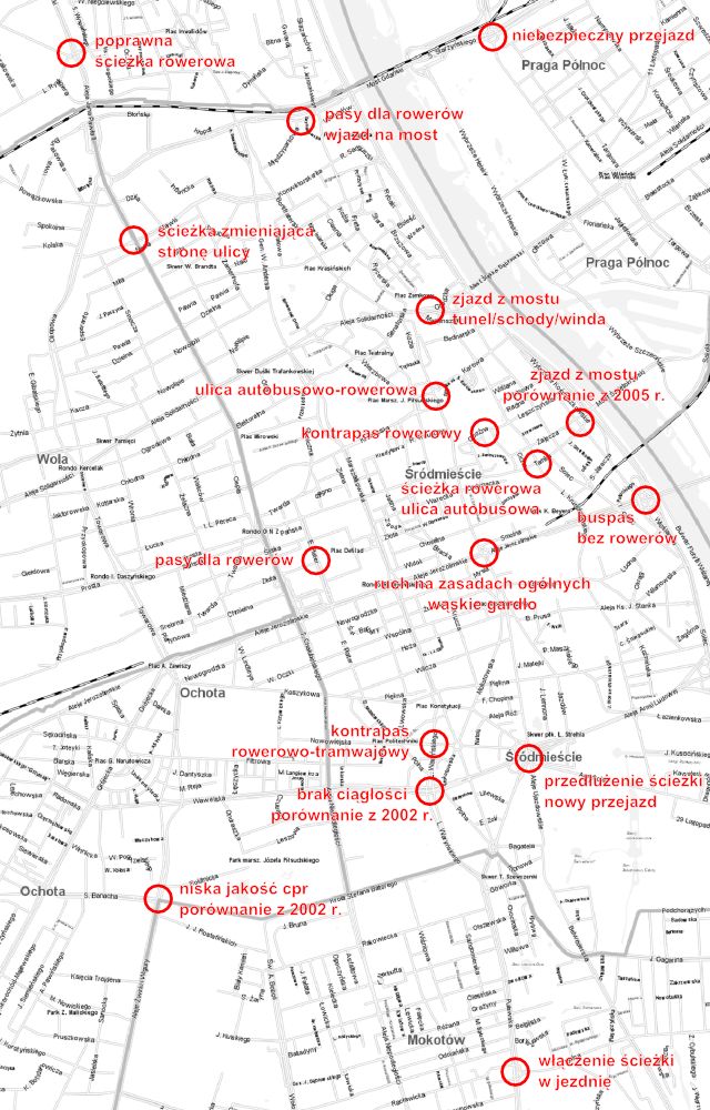 Punkty pomiarowe zostały tak dobrane, by obejmować różne rozwiązania rowerowe (wydzielone ścieżki, pasy na jezdni, kontrapasy, ulica rowerowo-autobusowa, włączenie ścieżki w jezdnię), potencjalne miejsca problematyczne (np. ślepe zakończenie ścieżki, zmiana strony ulicy, pas autobusowy z zakazem ruchu rowerów) oraz rozwiązania typowe mogące stanowić punkt odniesienia.