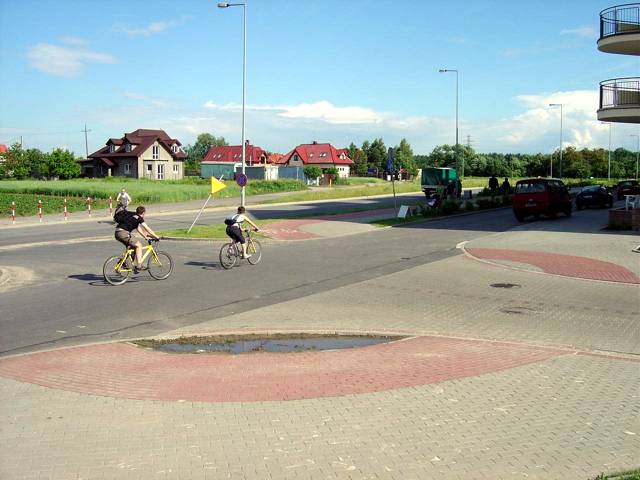 ŹLE: tor jazdy zamiast biec prosto, zupełnie niepotrzebnie prowadzi przez cztery zakręty i przecina trzy razy lokalne drogi osiedlowe. W dodatku "poszatkowana" na fragmenty nawierzchnia dezorientuje rowerzystów i nie uczula kierowców. Efekt: nikt nie jeździ rowerem tak, jak to sobie "wymarzył" projektant (Warszawa - Ursynów, ul. Relaksowa).