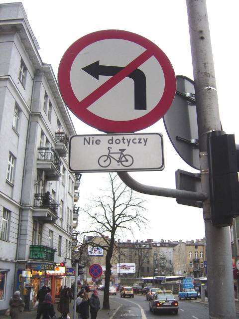Ten znak pozwala wjechać rowerem w ul. Półwiejską od Kościuszki. Ul. Półwiejska to w zasadzie strefa pieszo-rowerowa. Czyżby jej nazwę zainspirował Marek Woś? Wbrew niej jest to reprezentacyjny pasaż handlowo-usługowy nie gorszy od stołecznej Chmielnej.