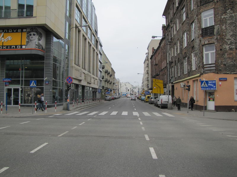 Obecnie ul. Okrzei to nieprzyjemny, hałaśliwy kanion. Ponad 80% szerokości ulicy od ściany do ściany zaanektowały samochody - na 3 pasy ruchu i parkowanie na chodnikach. Piesi przeciskają się pod murami i uciekają stąd jak najprędzej.