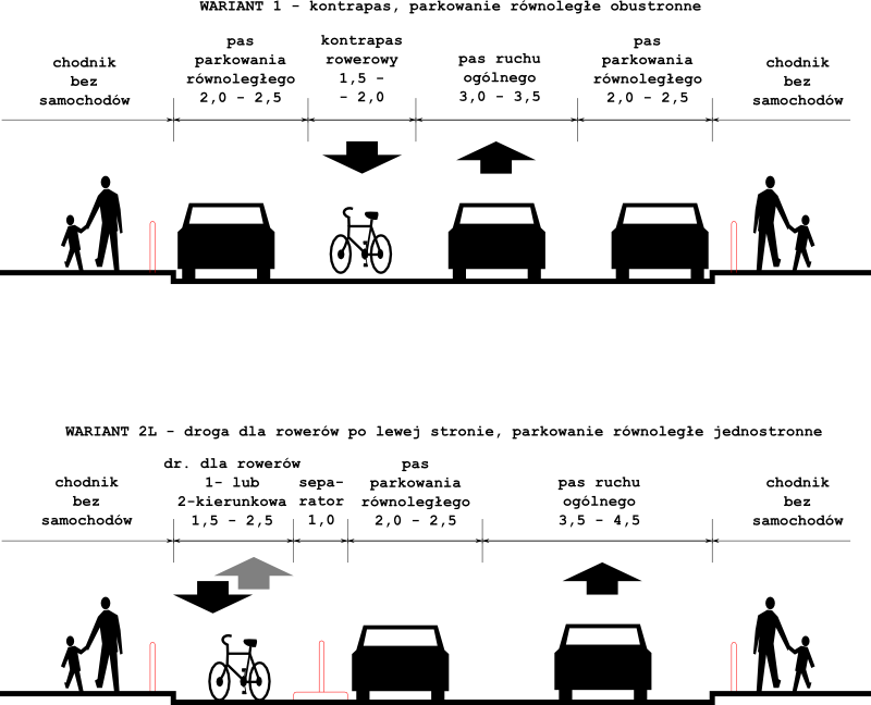 Porównanie przekrojów poprzecznych ulicy w wariantach 1 i 2L. Wymiary podane z widełkami, bo jest tu pewne pole manewru, poza tym szerokość istniejącej jezdni trochę się zmienia.