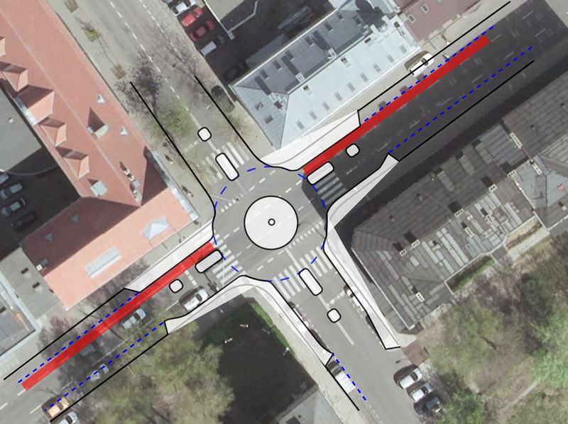 Sygnalizacje na tych dwóch skrzyżowaniach można też całkowicie skasować i zastąpić je minirondami z całkowicie lub częściowo przejezdną wyspą centralną (ze względu na autobusy komunikacji miejskiej). Zaletą tego rozwiązania byłoby uspokojenie ruchu i obniżenie kosztów utrzymania, wadą - odsunięcie od skrzyżowań przejść dla pieszych.