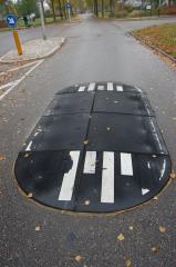 Rozwiązanie takie również jest odpowiednie dla ulic z autobusami. Warto też zwrócić uwagę na sam próg - tutaj zastosowano prefabrykat betonowy, wbudowany w nawierzchnię, trwalszy i z sinusoidalnymi najazdami (bez załamań).