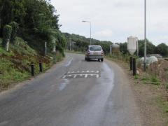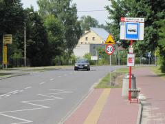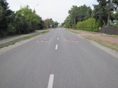 Widok w przeciwną stronę. Azyl jest zbyt wąski, by mógł służyć jako miejsce zatrzymania pieszych, ale utrudnia omijanie progu i wyprzedzanie w rejonie przejścia.