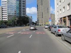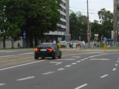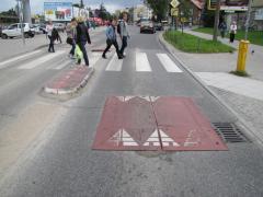 ...albo tramwajem. Progi ewidentnie pomagają zdjąć nogę z gazu przed przejściem dla pieszych, jednak wydaje się, że w tym przypadku lepiej byłoby zacząć od zwężenia jezdni i wydzielenia torowiska.