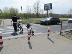 Po obu stronach zwężenia wyspy dzielące, a za nimi swobodny przejazd dla rowerzystów (i krawężnik, żeby przypadkiem kierowcy nie próbowali po pasie rowerowym jeździć).